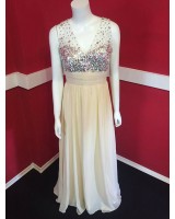 Роклята е със свободен, разкроен дизайн, което я прави изключително подходяща и за дами с по- пищни форми. Декорацията е само в горната част на роклята, благодарение на което тя изглежда луксозно, без излишен кич.